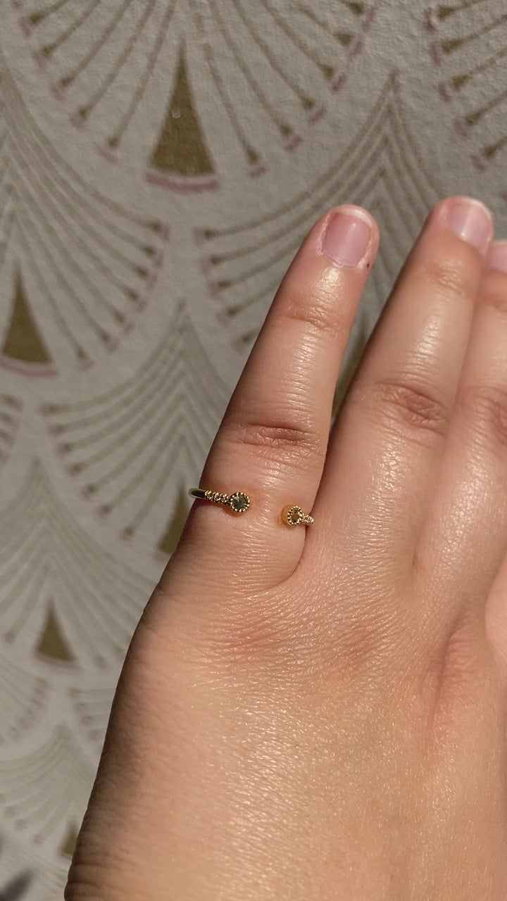 Add an unexpected twist to your ring stack with the Green Sapphire Bezel Equilibrium Cuff Ring by Jennie Kwon. Designed as a modern gap wedding band or open ring, this distinctive piece features two bezel-set green sapphires, grounded by a row of tiny, brilliant white diamonds in Kwon’s signature equilibrium setting.